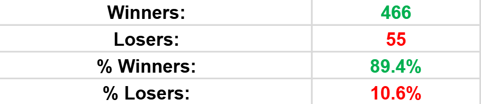You would have been placing the same trade targeting $100-$150 every day for the last 15 months and landed 400 wins with an 89.4% win rate.